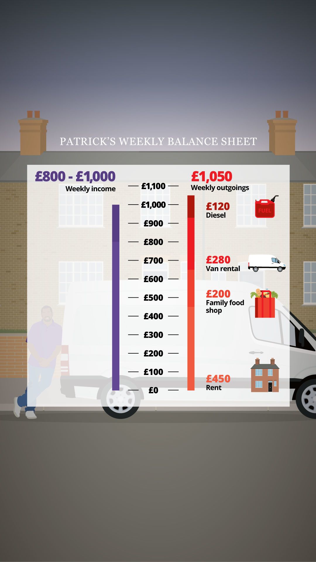 Forced into a precarious type of self-employment, Patrick and his colleagues have few rights but enormous financial responsibilities; paying for their own diesel, van rental, parking and congestion charges.